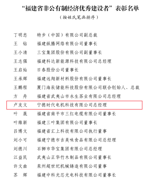 2025年6月18日福建省人民政府最新表彰决定中,宁德时代电机科技有限公司总经理卢友文先生被授予“福建省非公有制经济优秀建设者”荣誉称号!这份沉甸甸的荣誉,不仅是对卢友文总经理个人卓越领导力和企业家精神的嘉奖,更是对宁德时代电机科技有限公司(以下简称“时代电机”)全体同仁勠力同心、拼搏奋进所取得成就的肯定!
